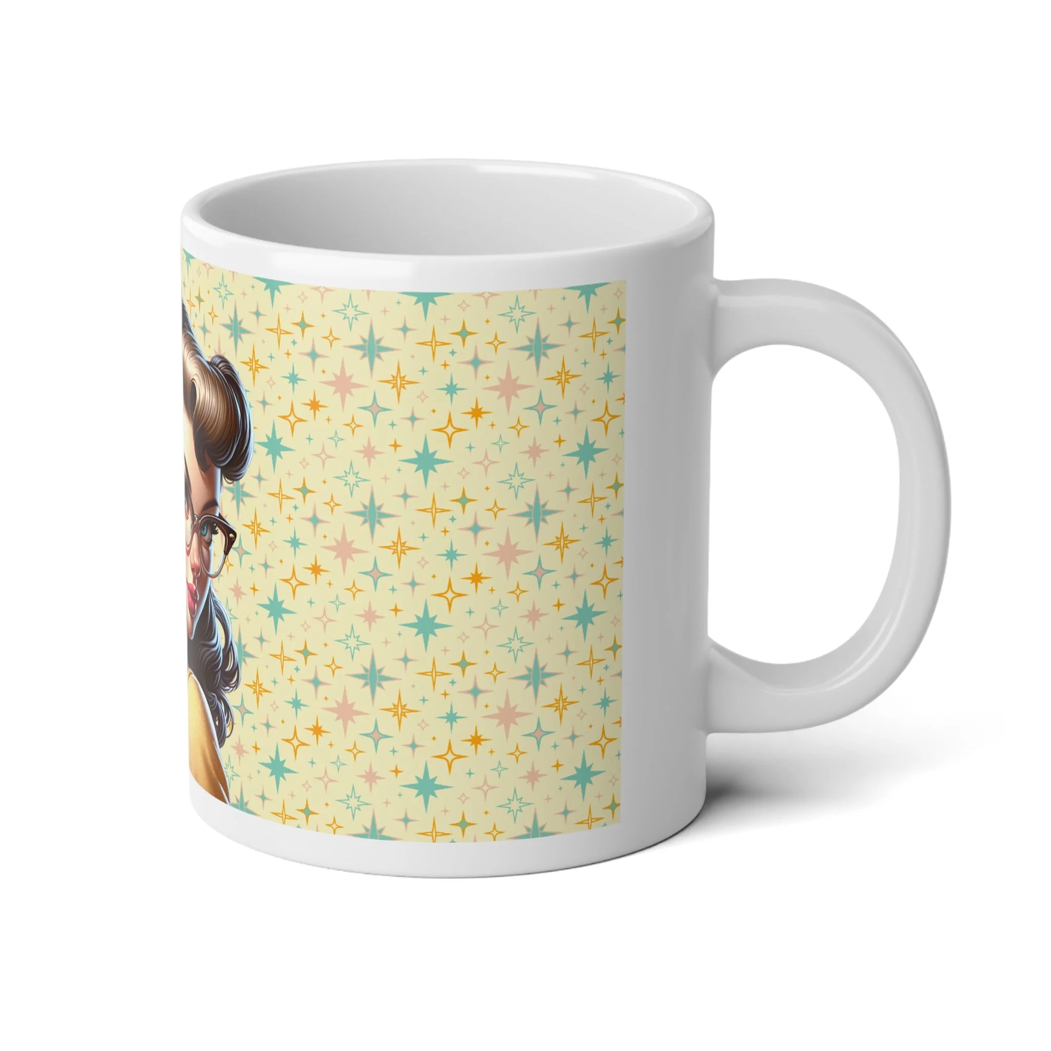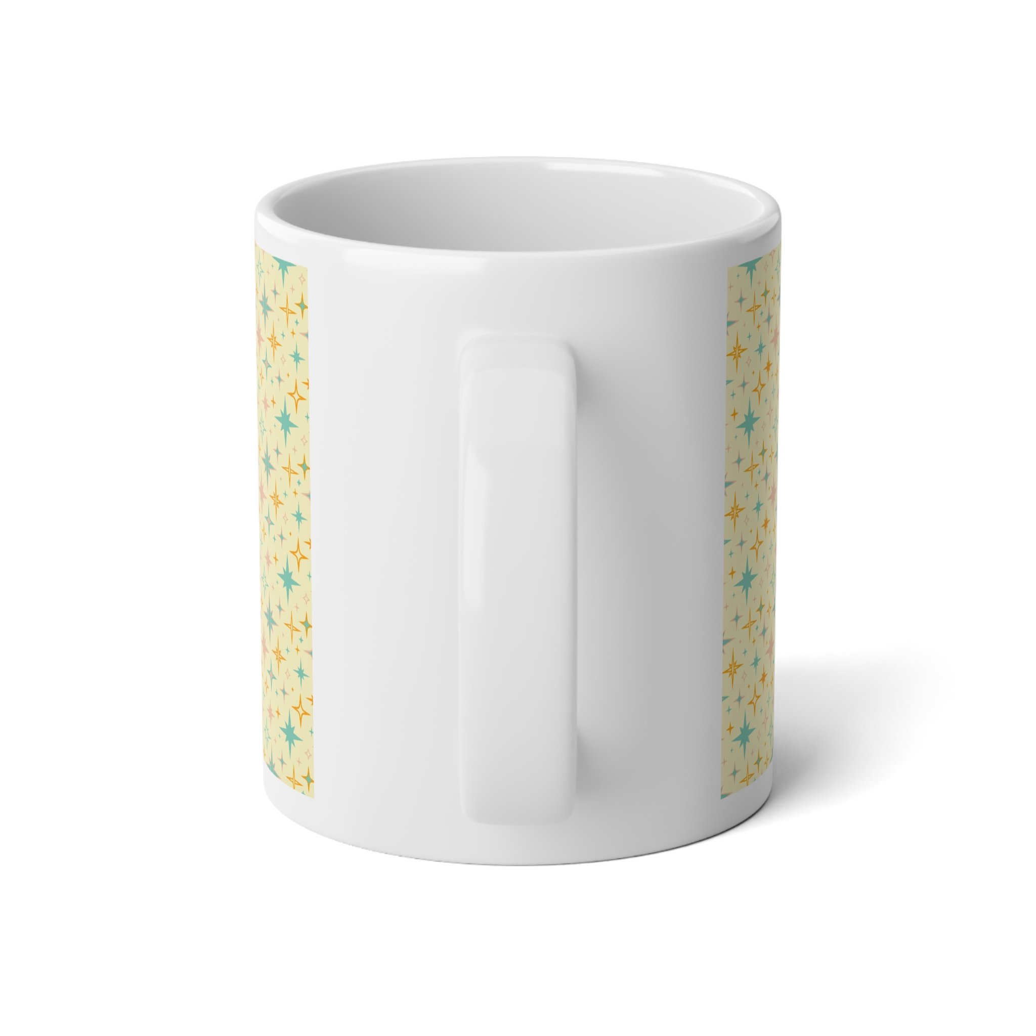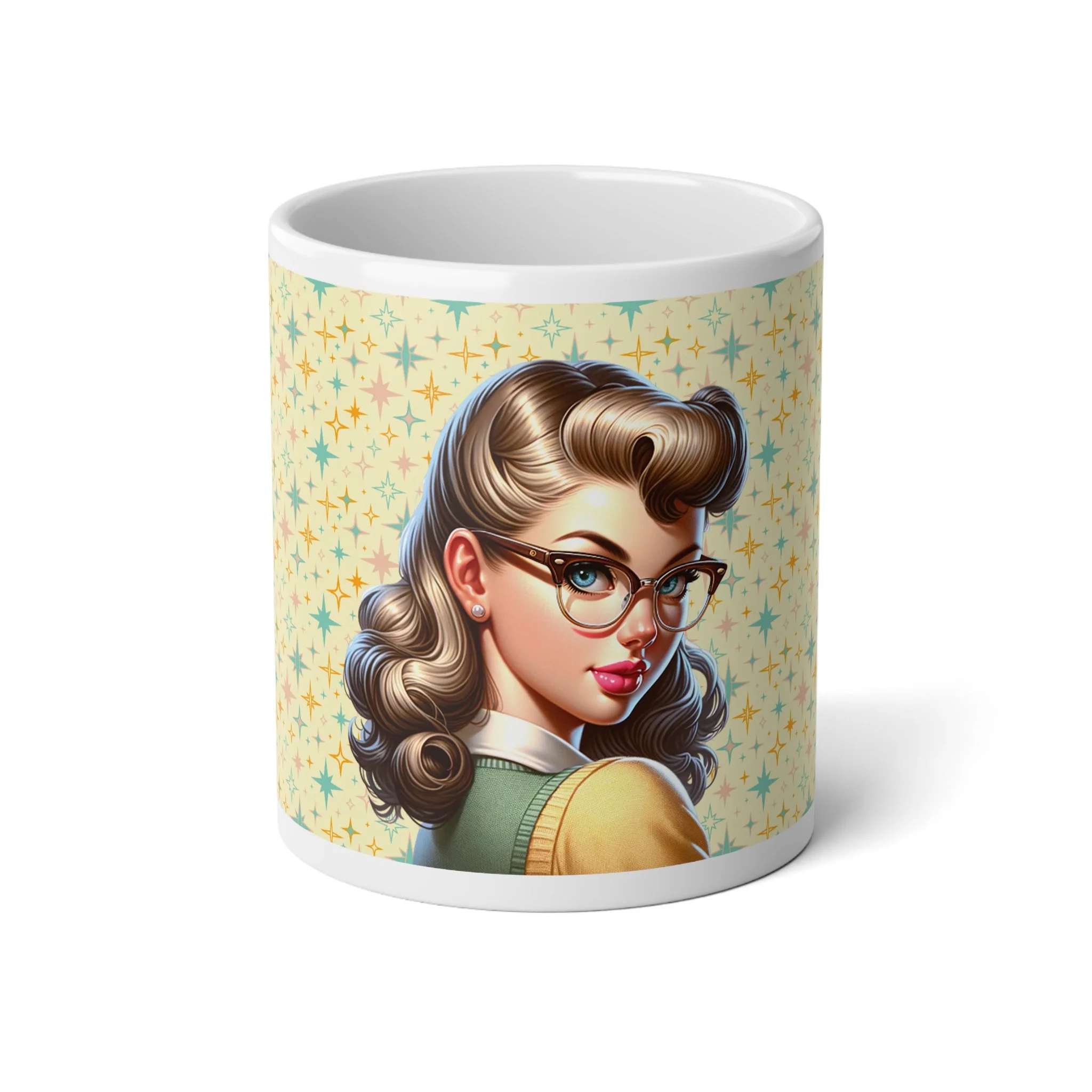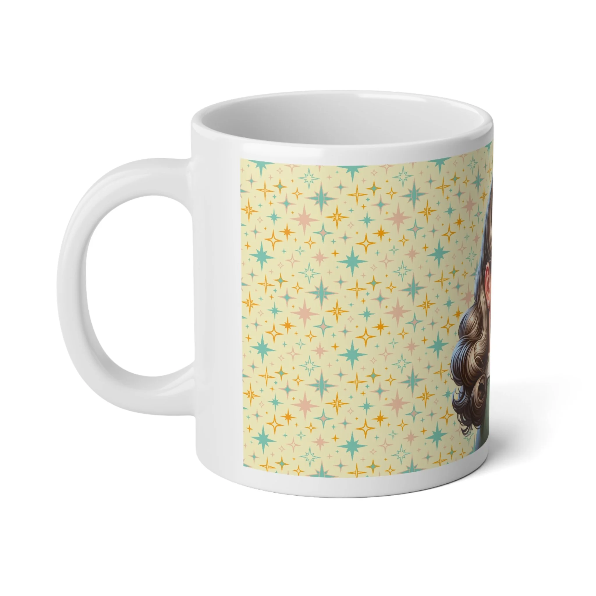 This 20oz glossy ceramic mug brings a splash of vintage charm to your morning ritual. A pin-up–inspired portrait wraps around the mug against a warm, star-speckled background, the colors rendered bright and crisp thanks to ORCA coating and advanced printing. The large C-handle fits comfortably in hand while the generous capacity holds an extra-large pour of coffee, tea, or cocoa. Durable ceramic, microwave-safe convenience, and dishwasher-safe durability mean the artwork stays vivid through everyday use. Keep it on your desk, kitchen shelf, or beside your favorite armchair — it’s made to be used, admired, and passed around during slow, cozy conversations.