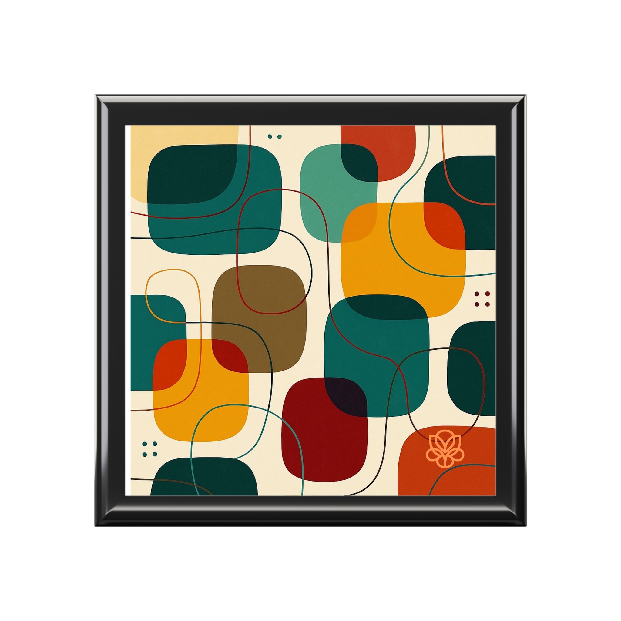 A compact, elegant jewelry box that brings a splash of retro-modern charm to a dresser or bedside table. The smooth rubberwood body is finished with a high-gloss varnish and topped with a vibrant 6" ceramic tile featuring rounded geometric shapes in teal, mustard, rust, and olive. Inside, soft felt cradles rings, chains, and small keepsakes while dual hinges hold the lid open at a steady 90° for easy access. The felted, slip-resistant base keeps the box firmly in place on wood or glass surfaces. Available in three glossy colorways to complement your room’s palette.