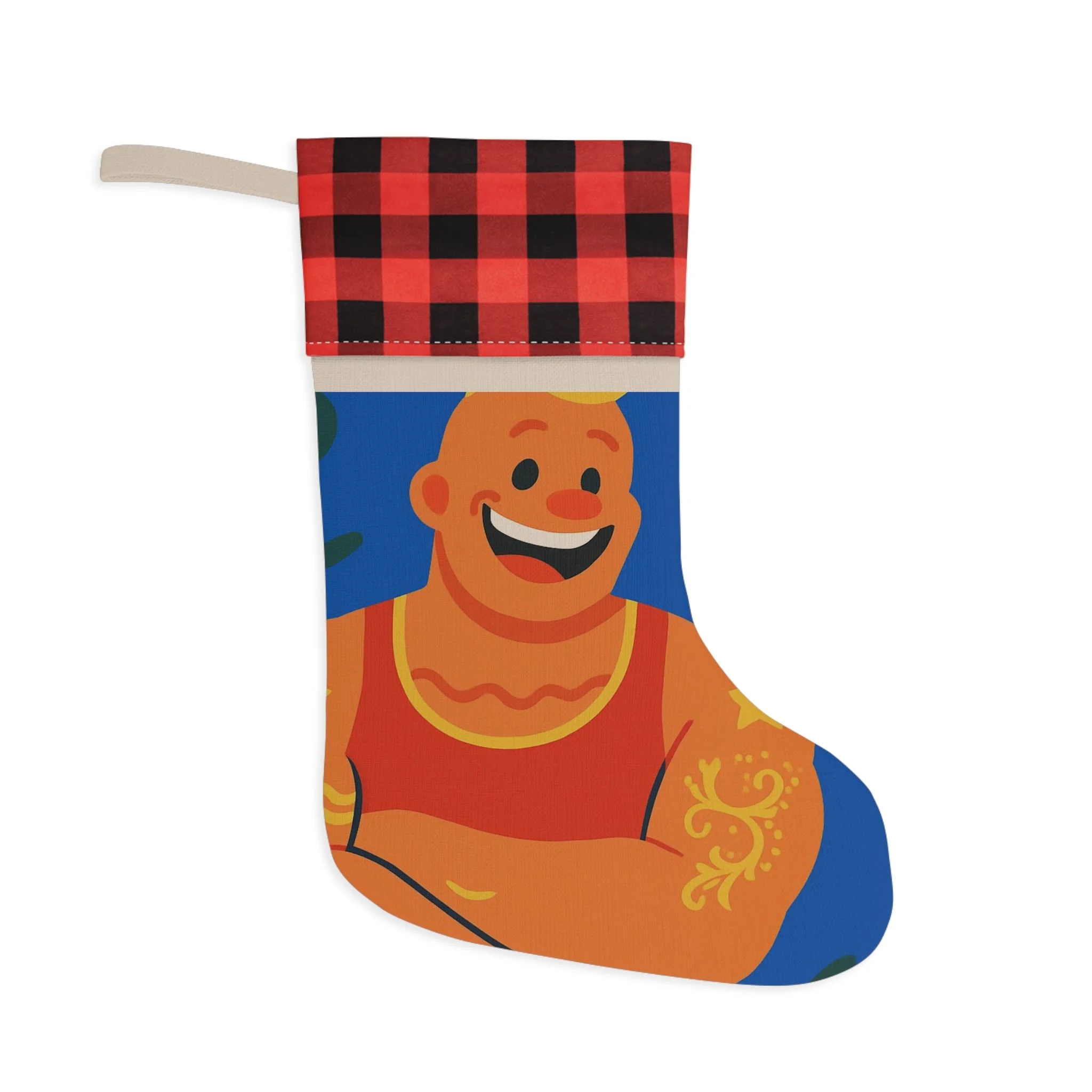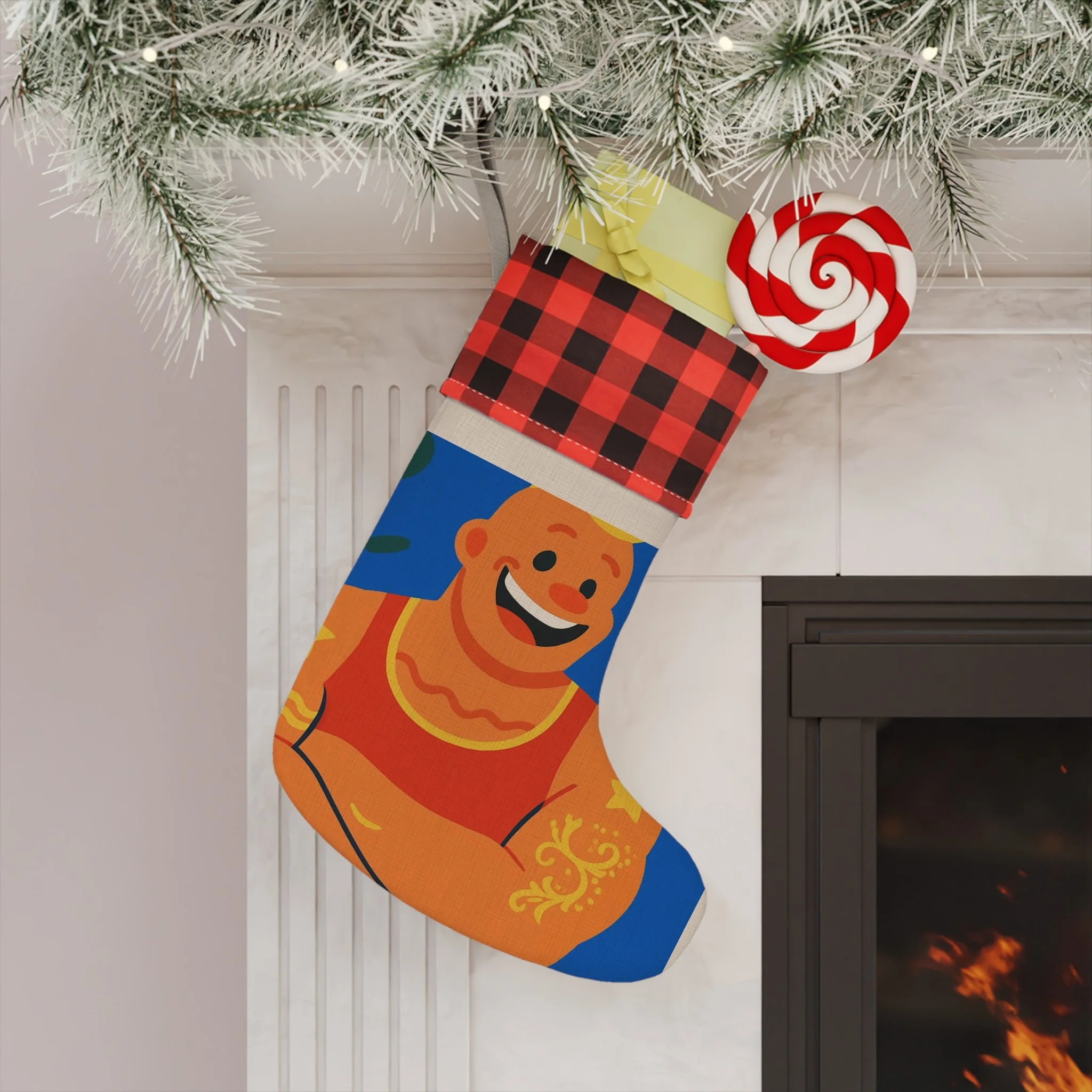 Buff Santa Christmas Stocking — Plaid Cuff Holiday Stocking with Muscular Santa Design