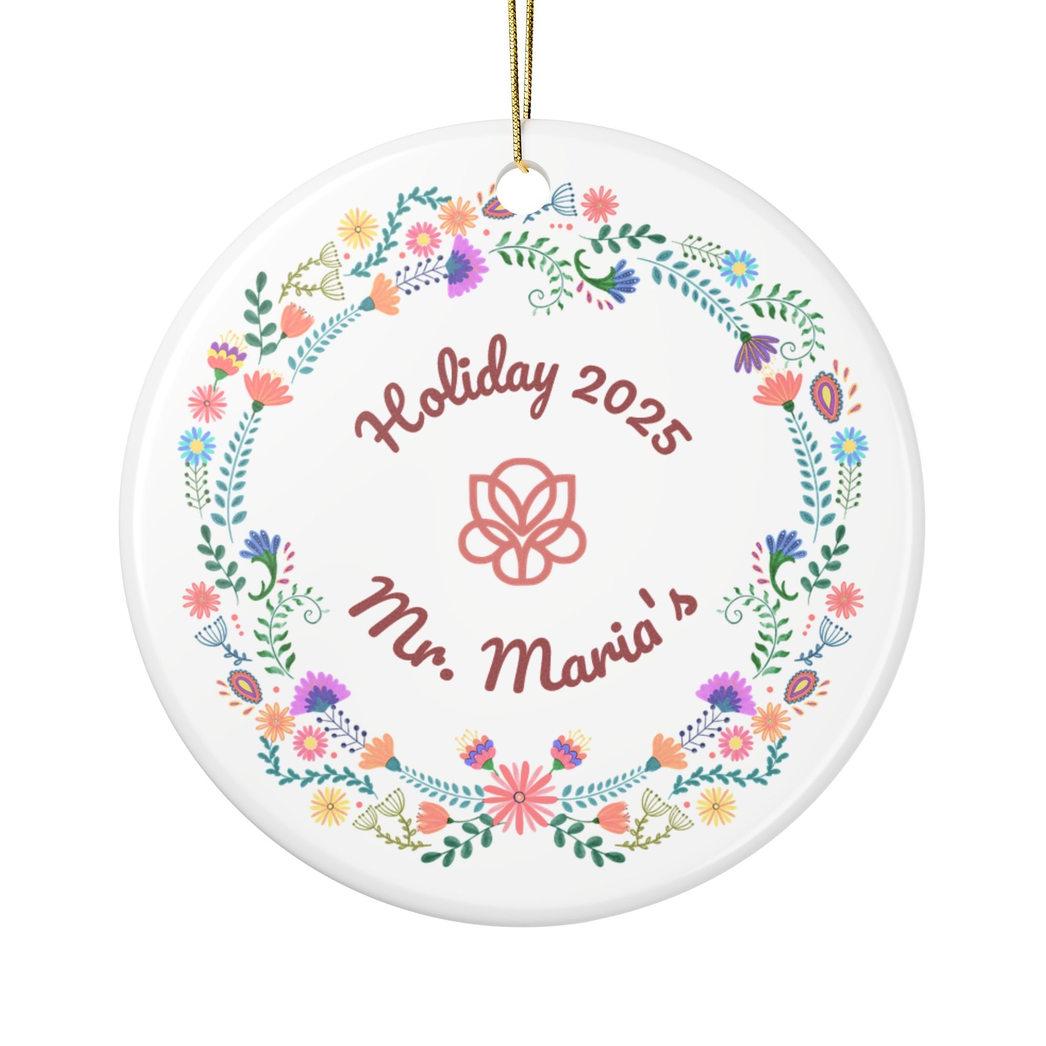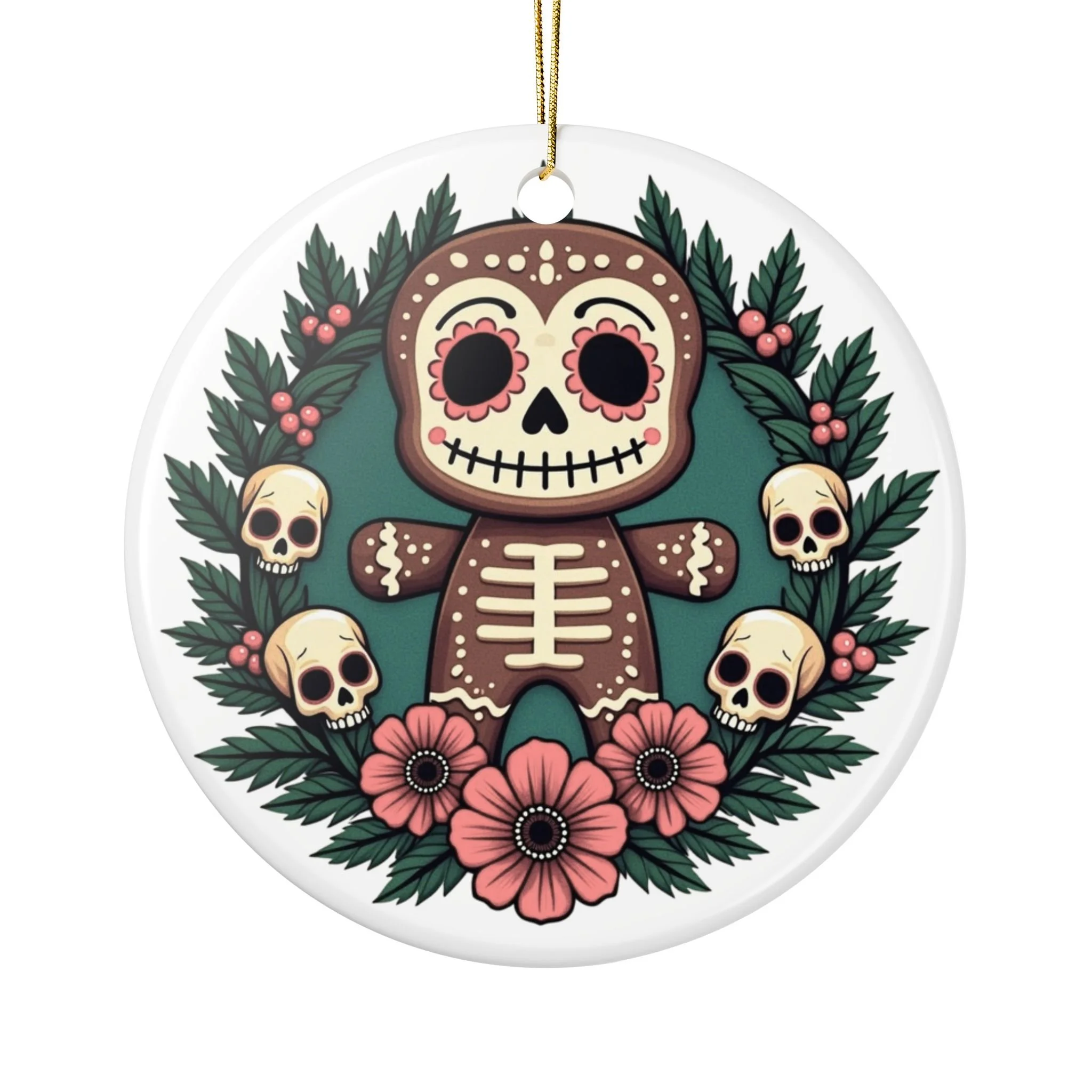 A hand-decorated ceramic ornament that brings playful, slightly spooky charm to holiday décor. One side shows a whimsical Día de los Muertos–inspired character framed by skulls, flowers, and dark greenery — a mix of sweet and macabre that feels personal and handcrafted. The reverse side holds a soft floral wreath with space for a name and date, turning the piece into a keepsake for holiday 2025 or a memorable classroom, family, or teacher ornament. Lightweight but sturdy, it hangs from a shimmering gold string and slips easily onto branches, hooks, or wall pegs. Bring a touch of personality to your tree or seasonal display with an ornament that balances color, nostalgia, and a little mischief.