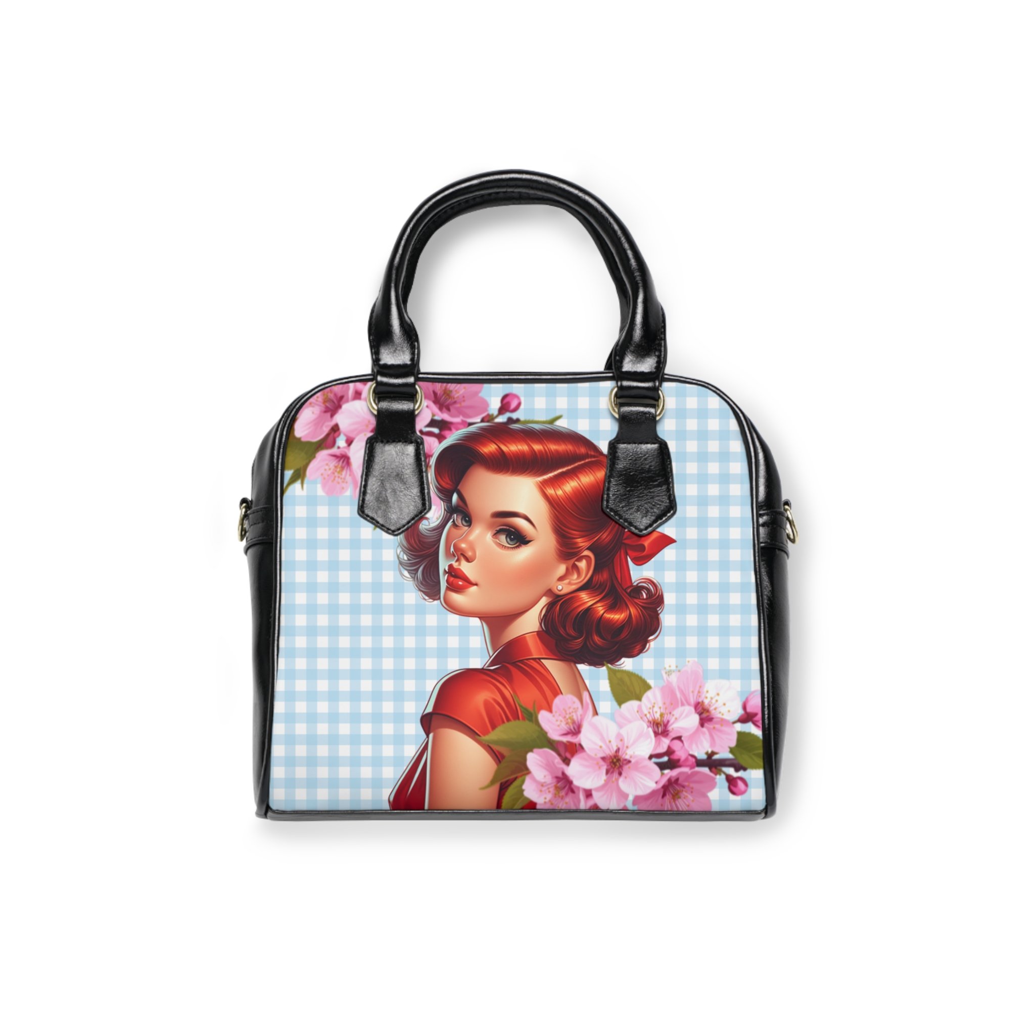 Think of sunlit afternoons at a vintage fair—this shoulder handbag channels that warm nostalgia with a modern twist. The front shows a retro-styled portrait framed by soft cherry blossoms; the back continues the floral scene over a pale gingham, giving the bag a wearable story from every angle. Smooth black handles and a removable, adjustable shoulder strap let you switch between arm carry and crossbody ease. Inside, a zip pocket and two open pockets keep your essentials organized so you can move through markets, coffee shops, or gallery openings with quiet confidence. The vivid double-sided print and polished PU leather finish make it feel special without asking for attention.