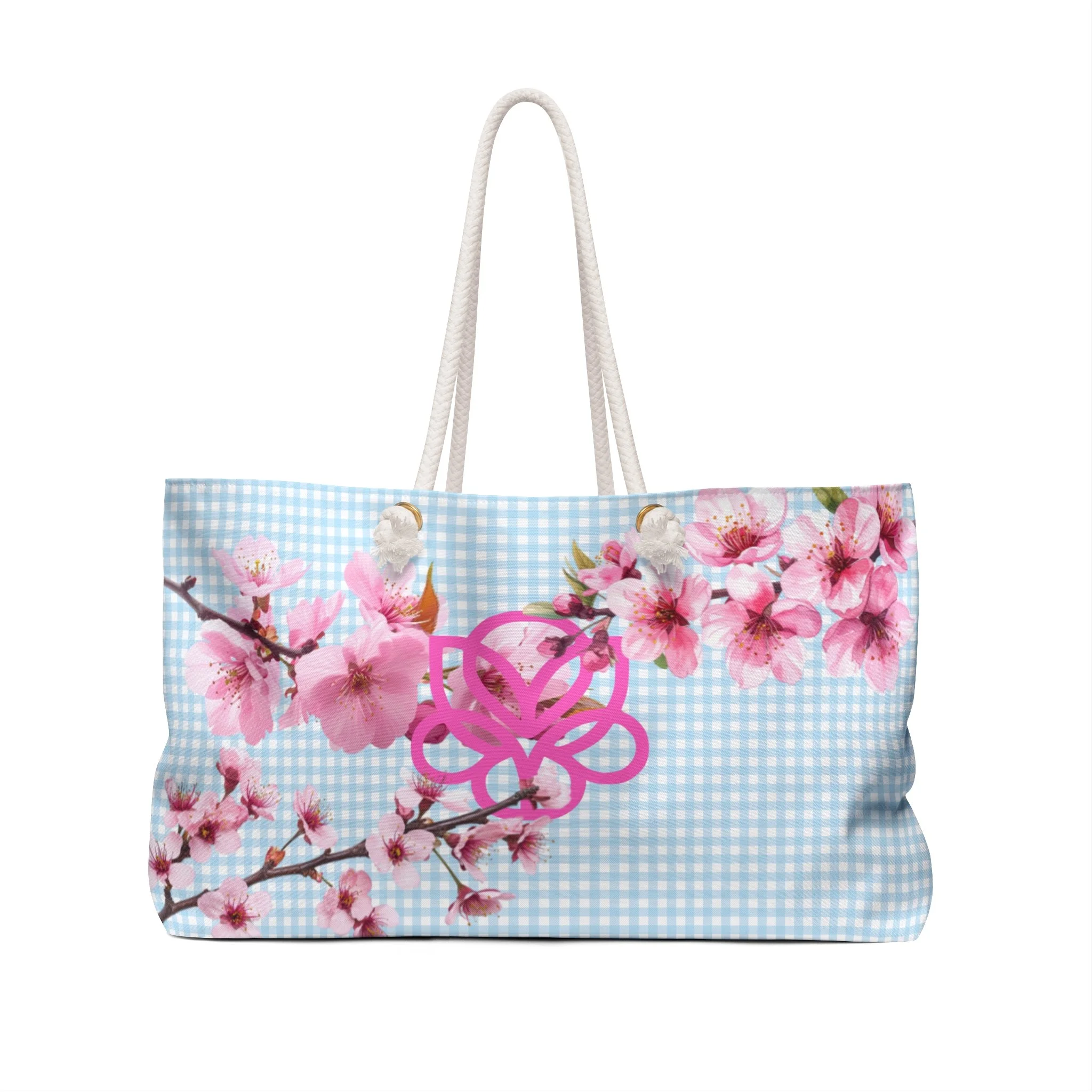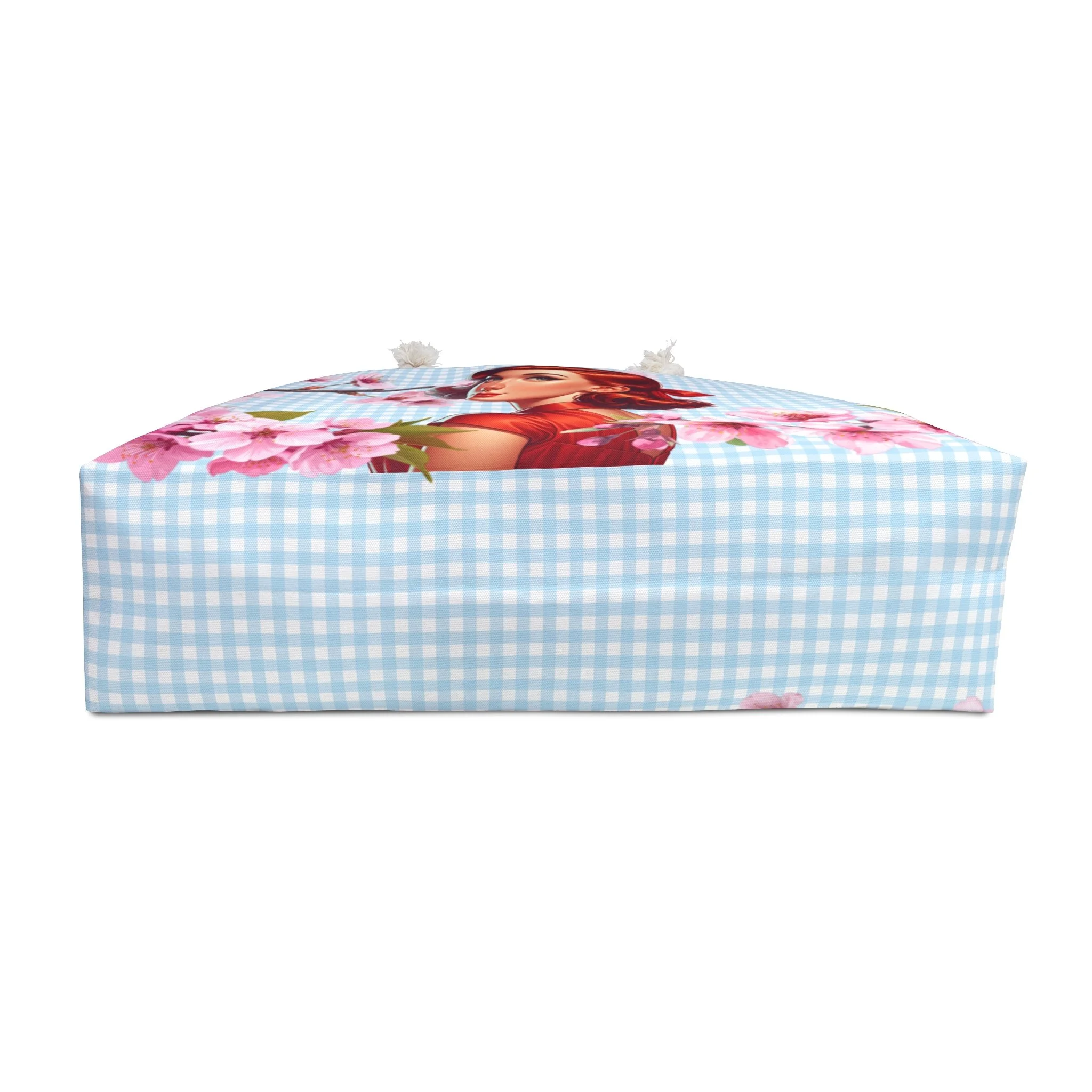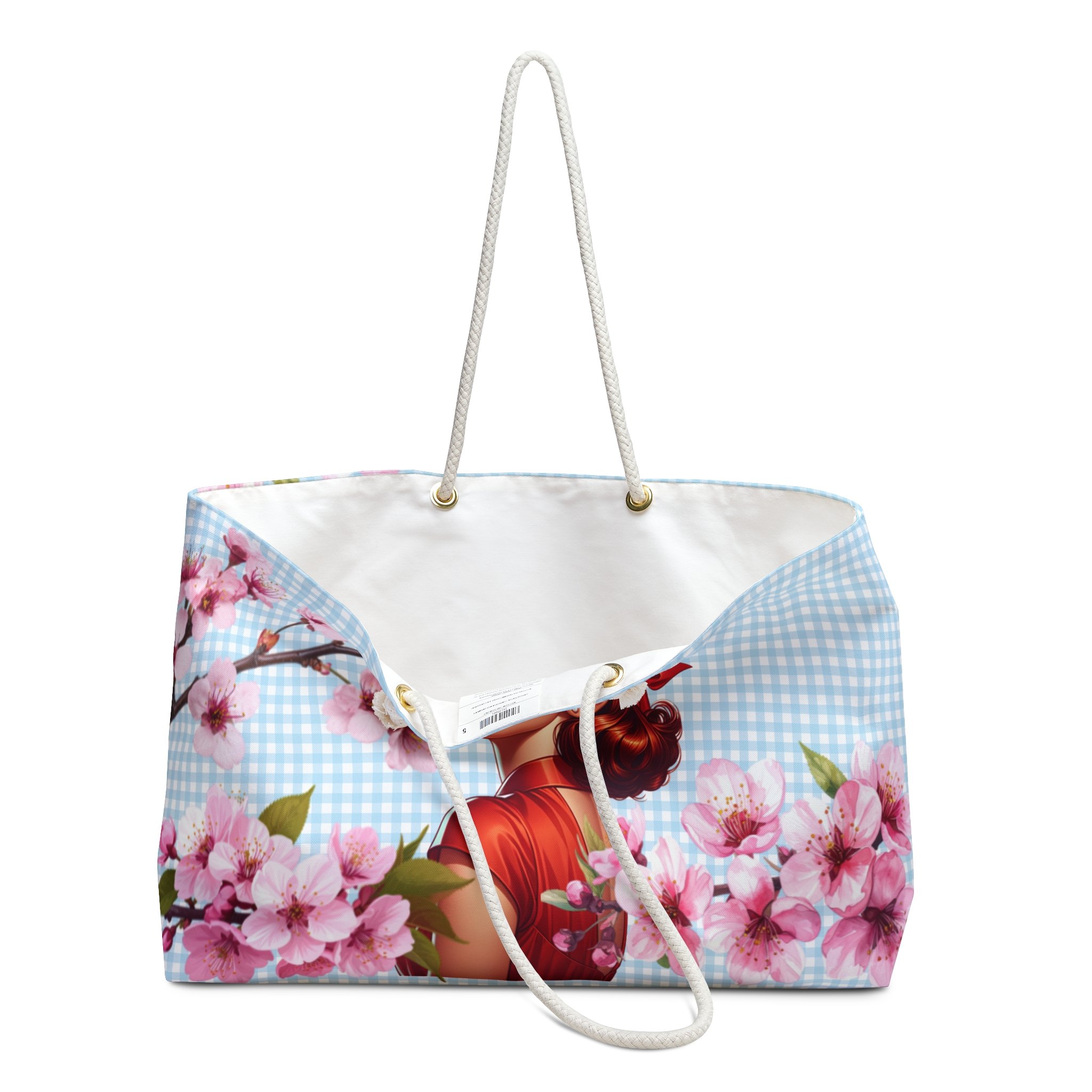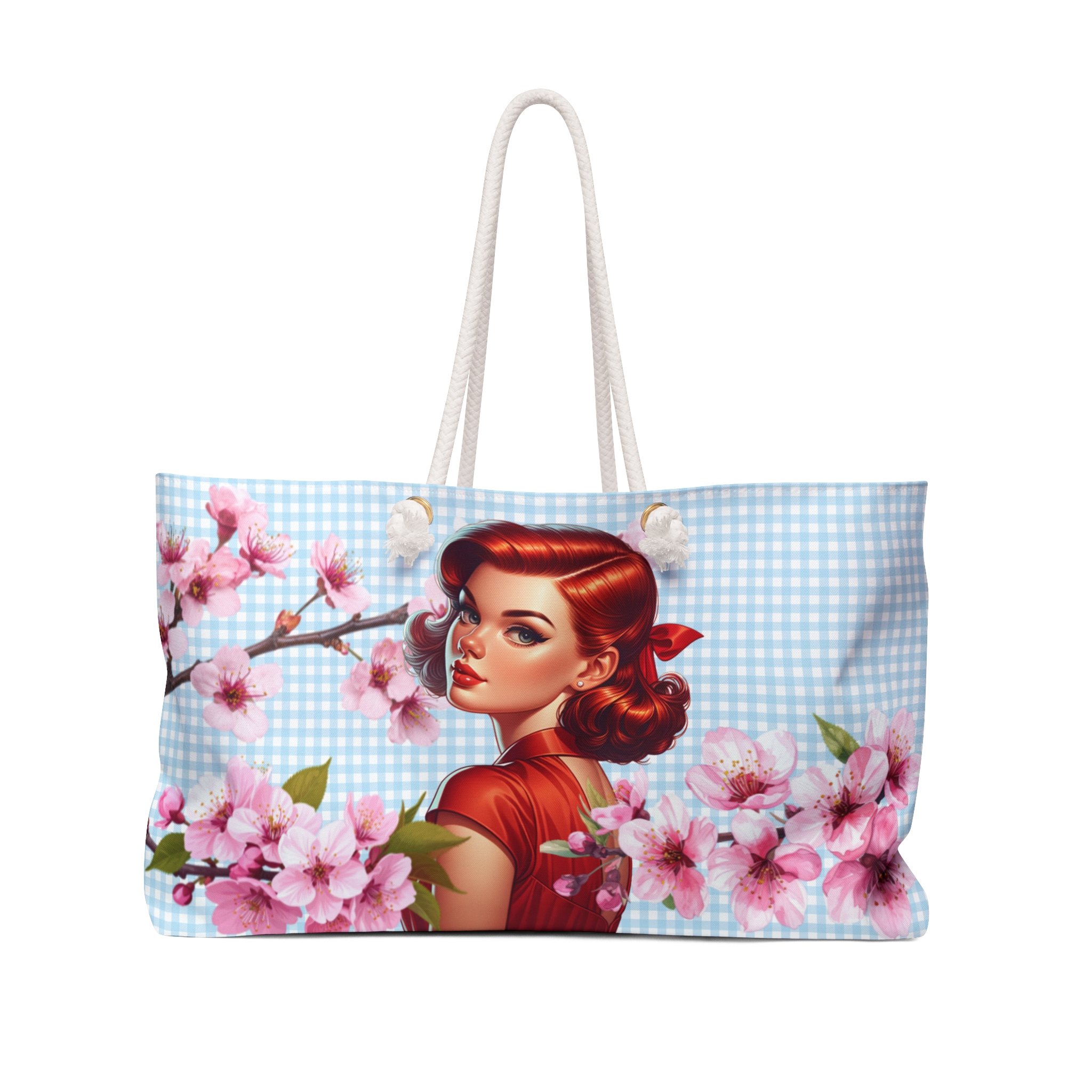This Weekender Bag carries a soft vintage mood—cherry blossoms drifting across a pale blue gingham background, and a retro-inspired portrait that feels like a sunlit snapshot from a summer road trip. The roomy T-bottom silhouette holds weekend clothes, market finds, or beach towels without wrinkling, while cream rope handles and gold-tone grommets add tactile warmth. Inside, a cream sheet lining gives a gentle contrast and protects contents. It’s the kind of bag that announces a leisurely pace: morning coffee stops, floral-filled errands, and escapes where style and ease travel together.