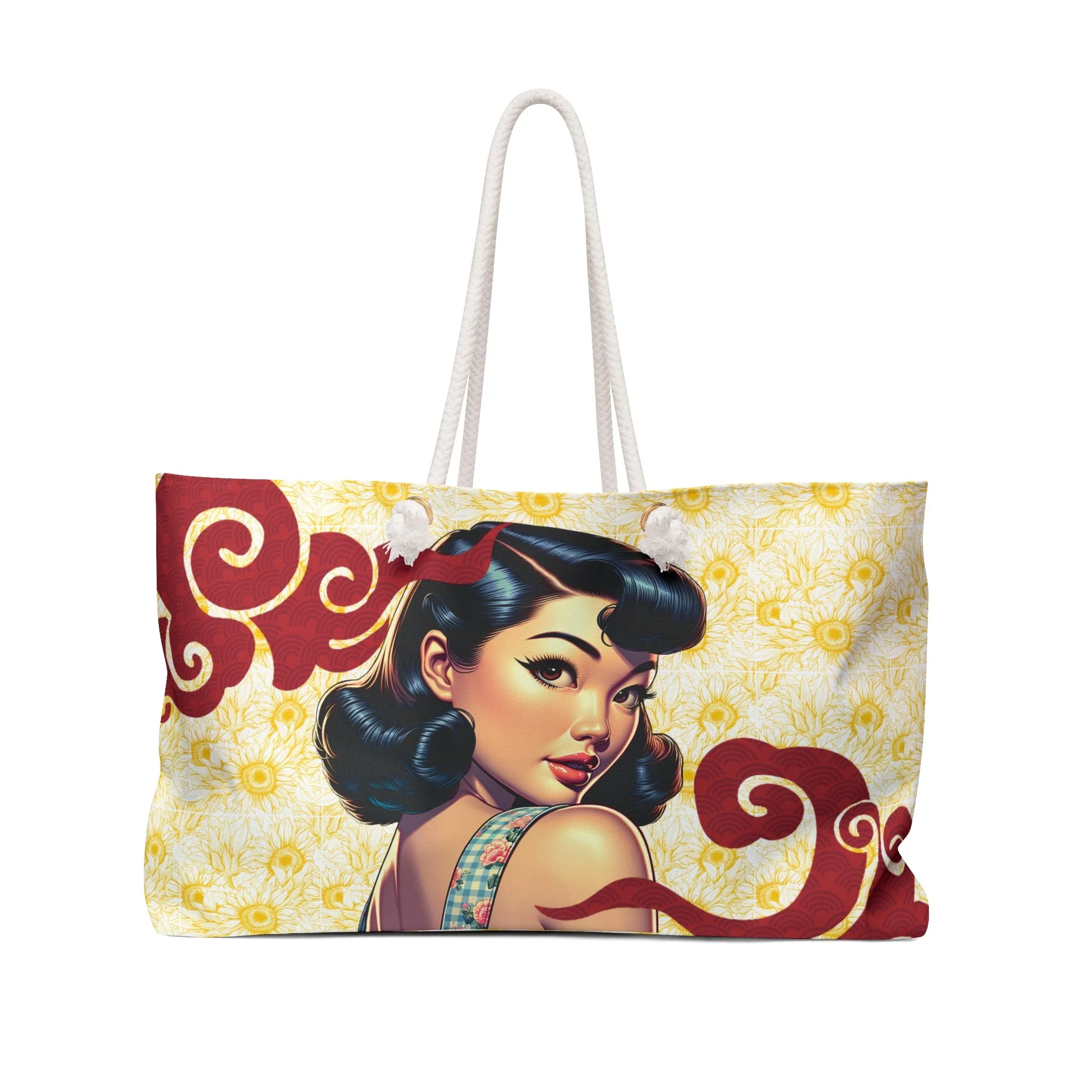 A roomy, sunlit carryall that channels retro pin-up charm with modern durability. Soft cream rope handles sit comfortably on the shoulder while the wide T-bottom gives this bag a relaxed, beach-to-brunch silhouette. The artwork—bold scarlet swirls and a vintage-inspired portrait against a warm floral ground—feels like a snapshot from a sunny coastal boardwalk. Lightweight spun polyester resists wrinkles and keeps the print bright; a cream cotton-blend lining adds a subtle, tactile contrast inside. Bring it along for weekend escapes, farmers’ markets, or days when you want a statement bag that still holds everything you need.