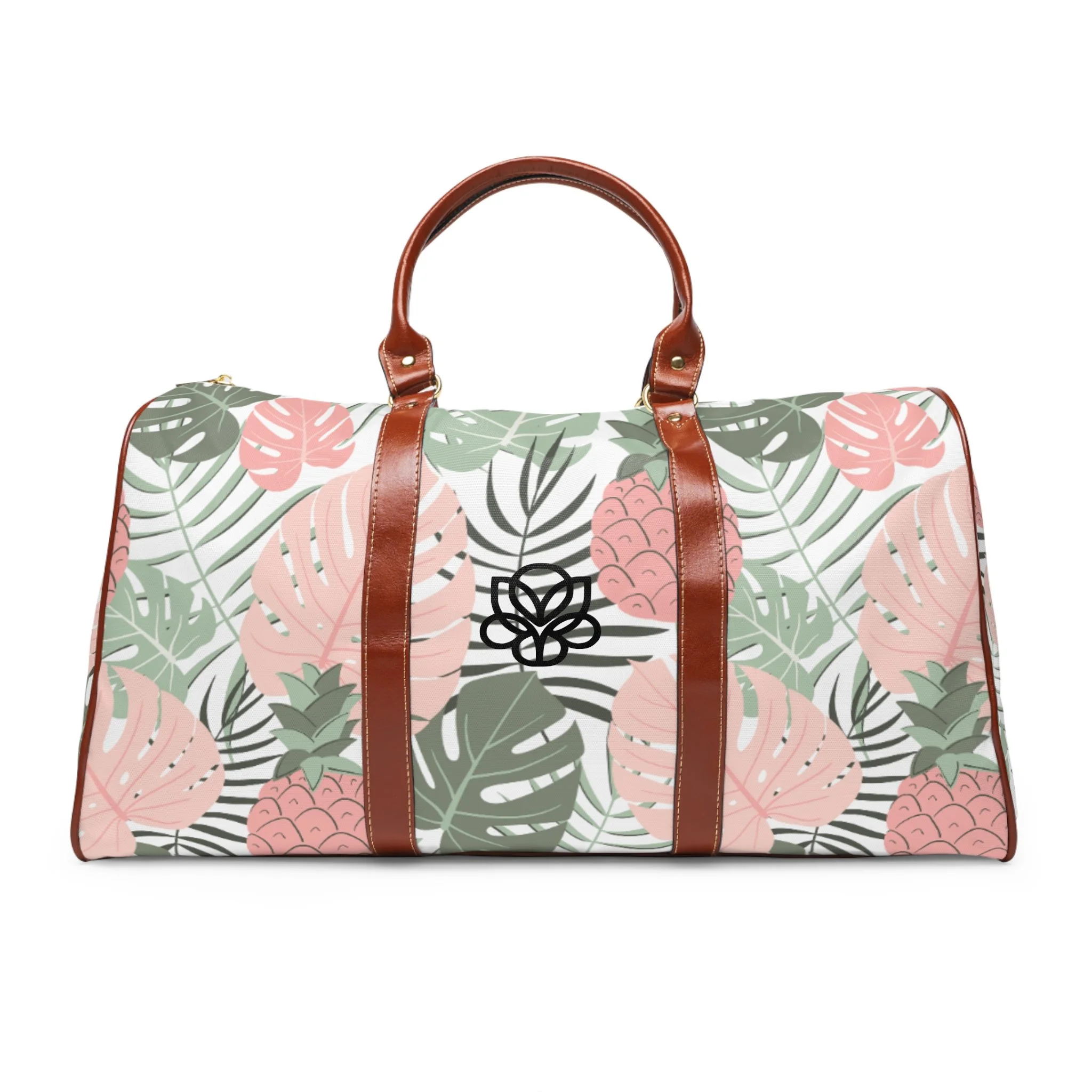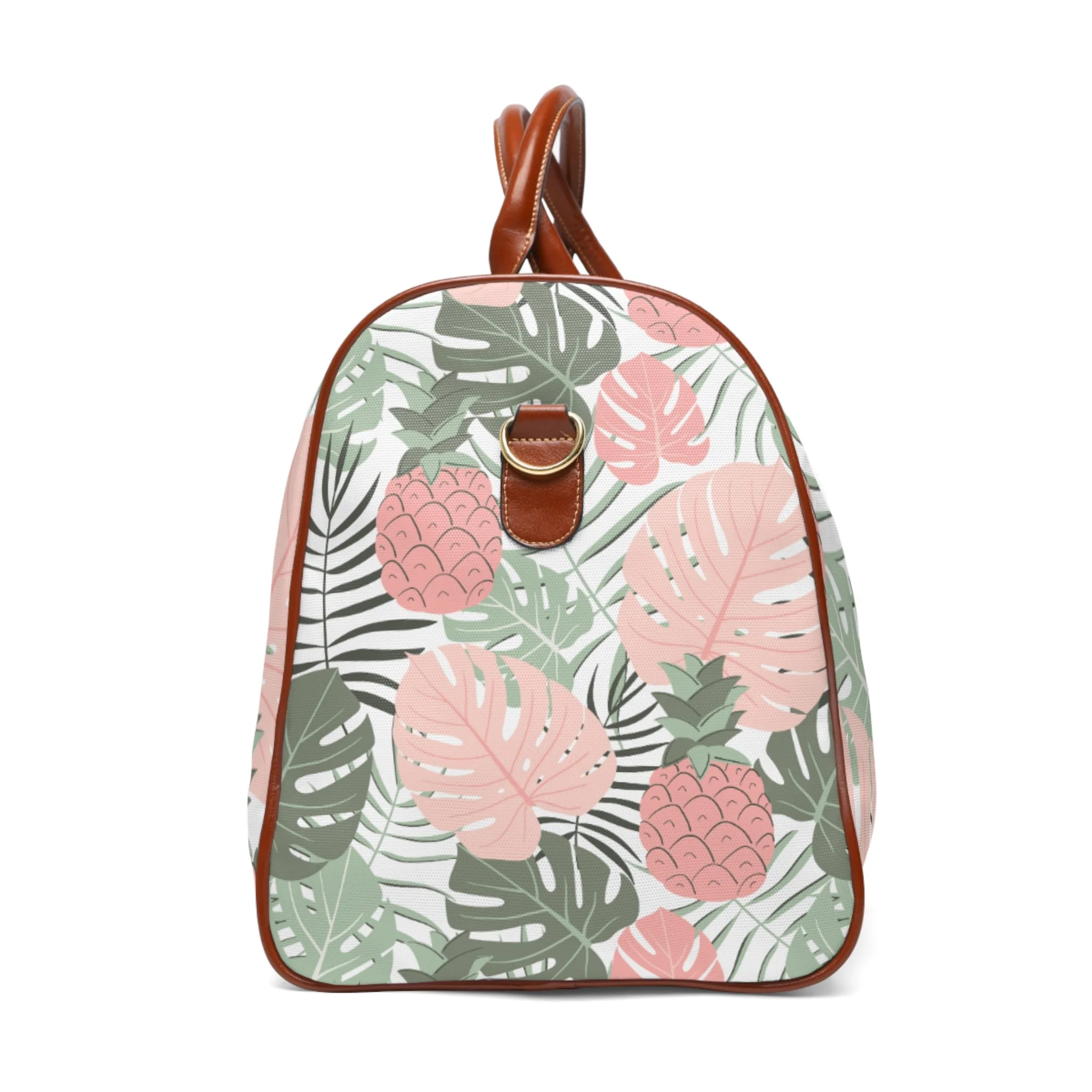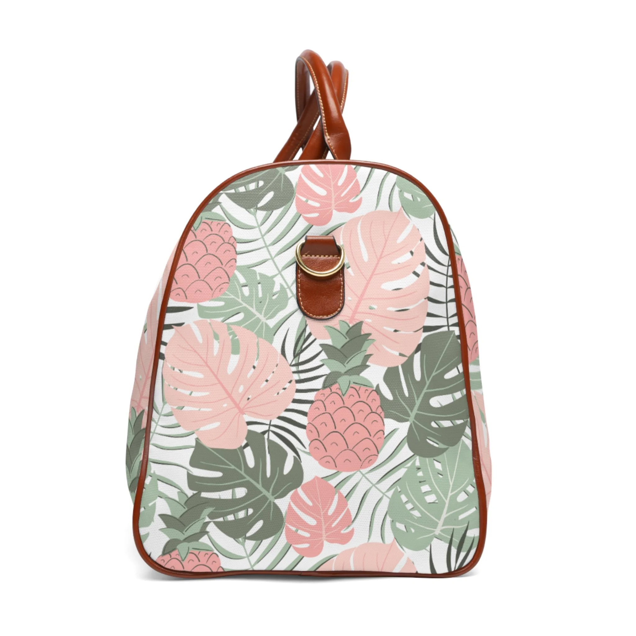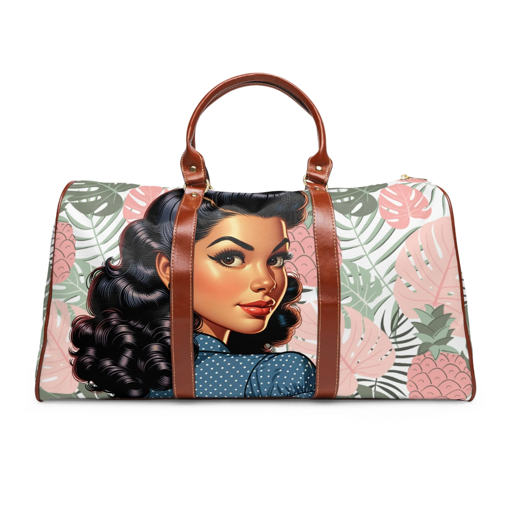 This travel bag brings vintage flair to weekend escapes. Its lively all-over print pairs tropical palms and pineapples with a bold retro portrait, so your bag stands out at the gate or by the pool. The high-grade nylon shell keeps the shape light and resilient, while the waterproof finish guards your essentials from sudden downpours and wet surfaces. Inside, a single open pocket tucks small items away, and the polyester lining helps everything slide in and out smoothly. Brown PU leather handles, an adjustable shoulder strap, and gold-colored zipper details give the bag a warm, stylish contrast that reads both classic and modern. At 20" × 12" × 9", it’s roomy enough for a weekend wardrobe or carry-on essentials without feeling bulky.