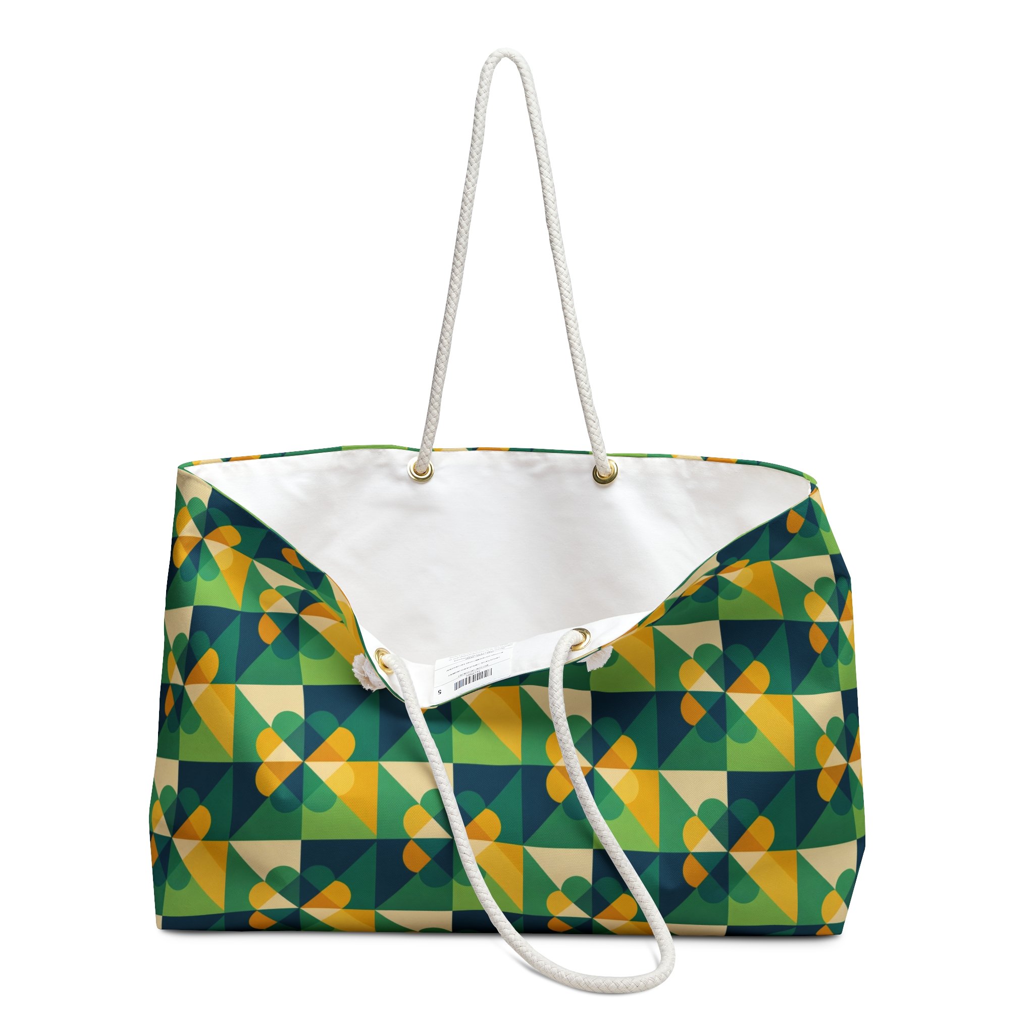 Bright, roomy, and effortlessly cheerful — this weekender bag carries the feel of a sunlit road trip. The geometric pattern mixes deep greens, warm golds, and soft teal in a retro-modern repeat that reads like motion and miles. Thick cream rope handles rest comfortably on the shoulder; the roomy T-bottom holds weeks’ worth of outfits or a weekend’s worth of sand, snacks, and books. Inside, a creamy cotton-blend lining keeps contents protected and easy to grab. Sturdy spun polyester outer fabric resists wrinkles and keeps the print vibrant through travel and daily use. Finished with gold-color grommets and assembled in the USA, this bag is built to travel with you — from weekend escapes to market runs and sunny ferry rides.