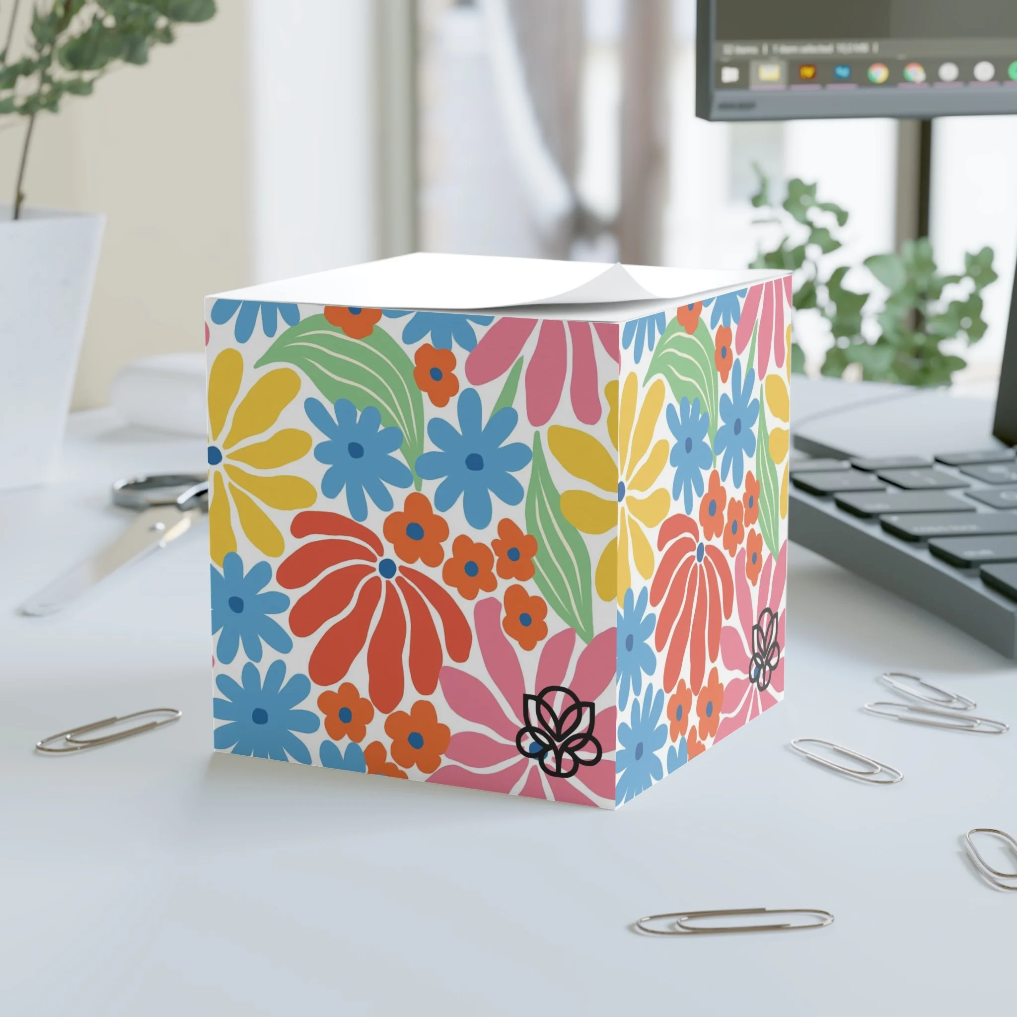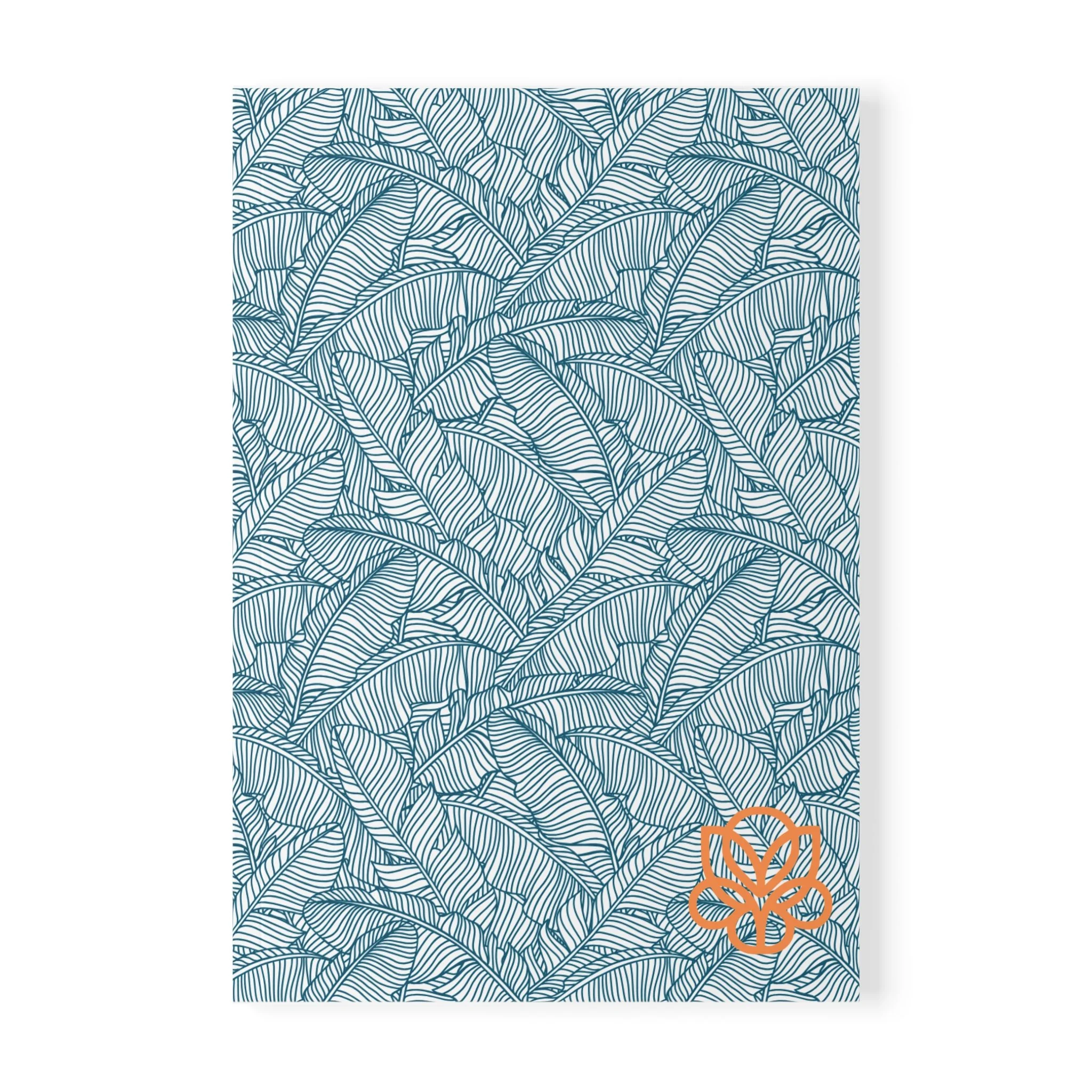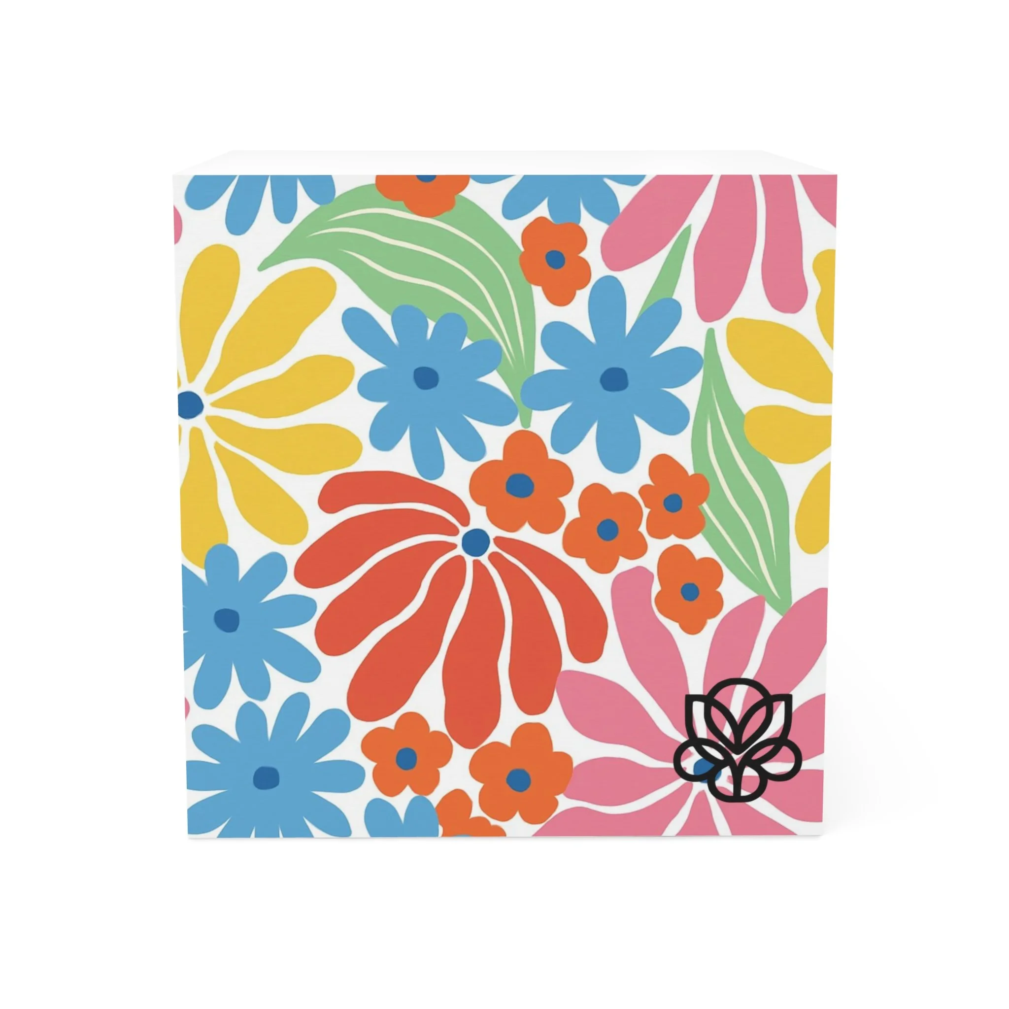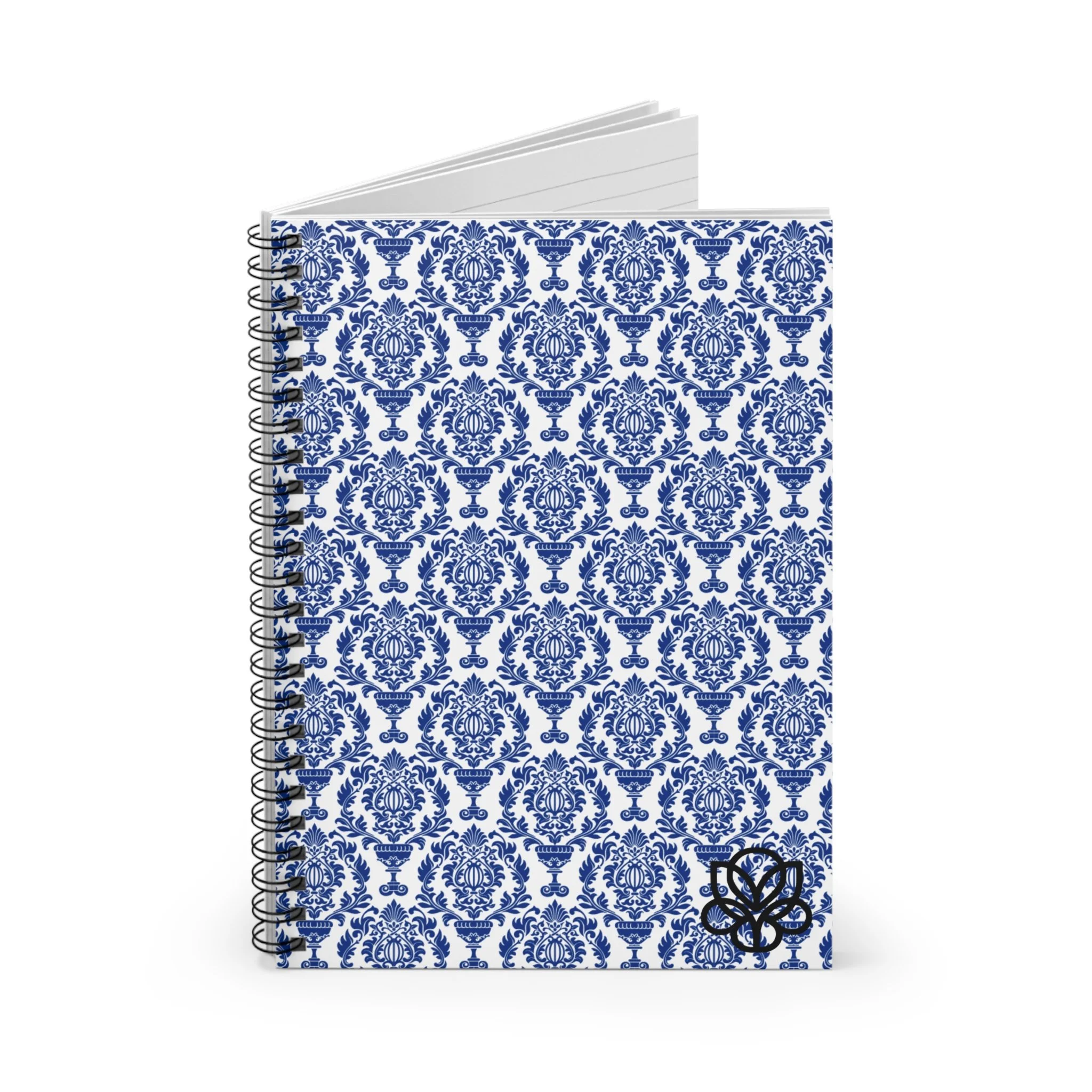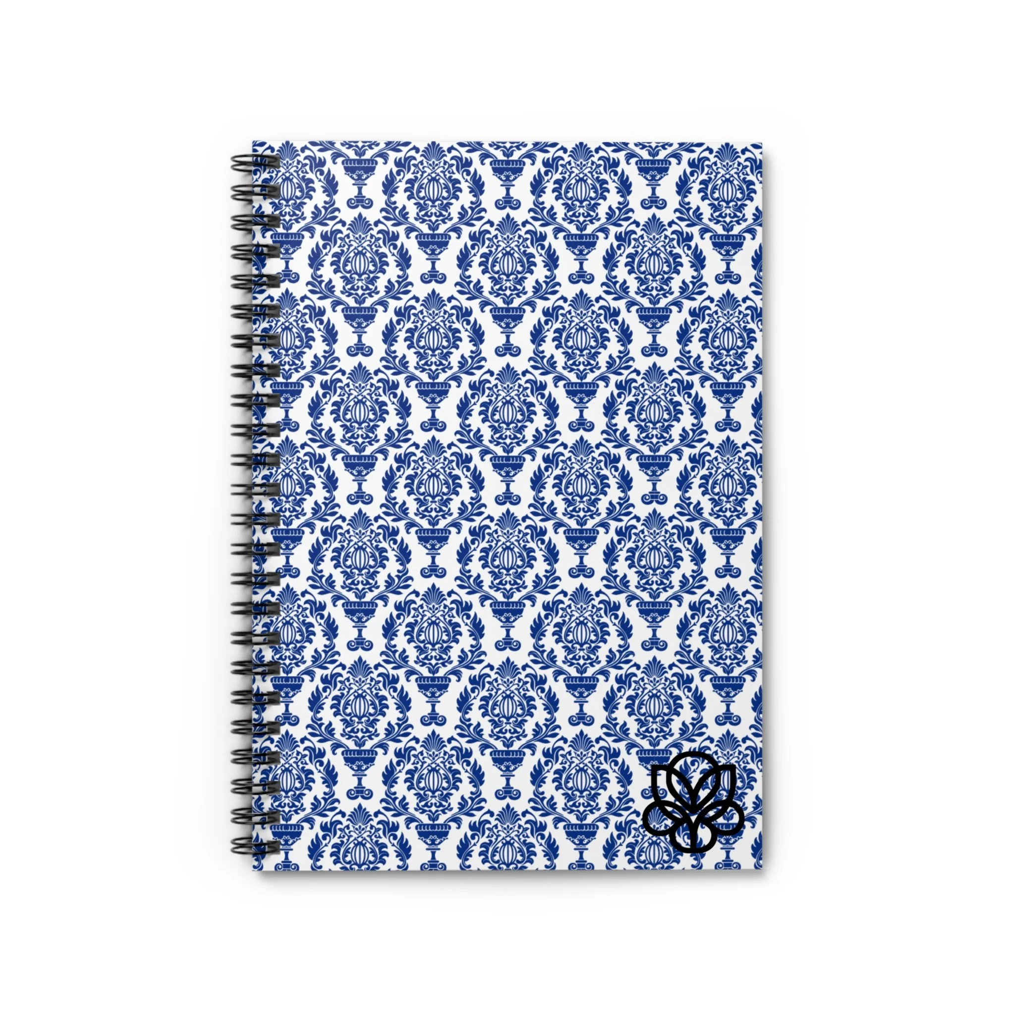 A clay pot with abstract blue, white, and terracotta paint strokes on a neutral background.
