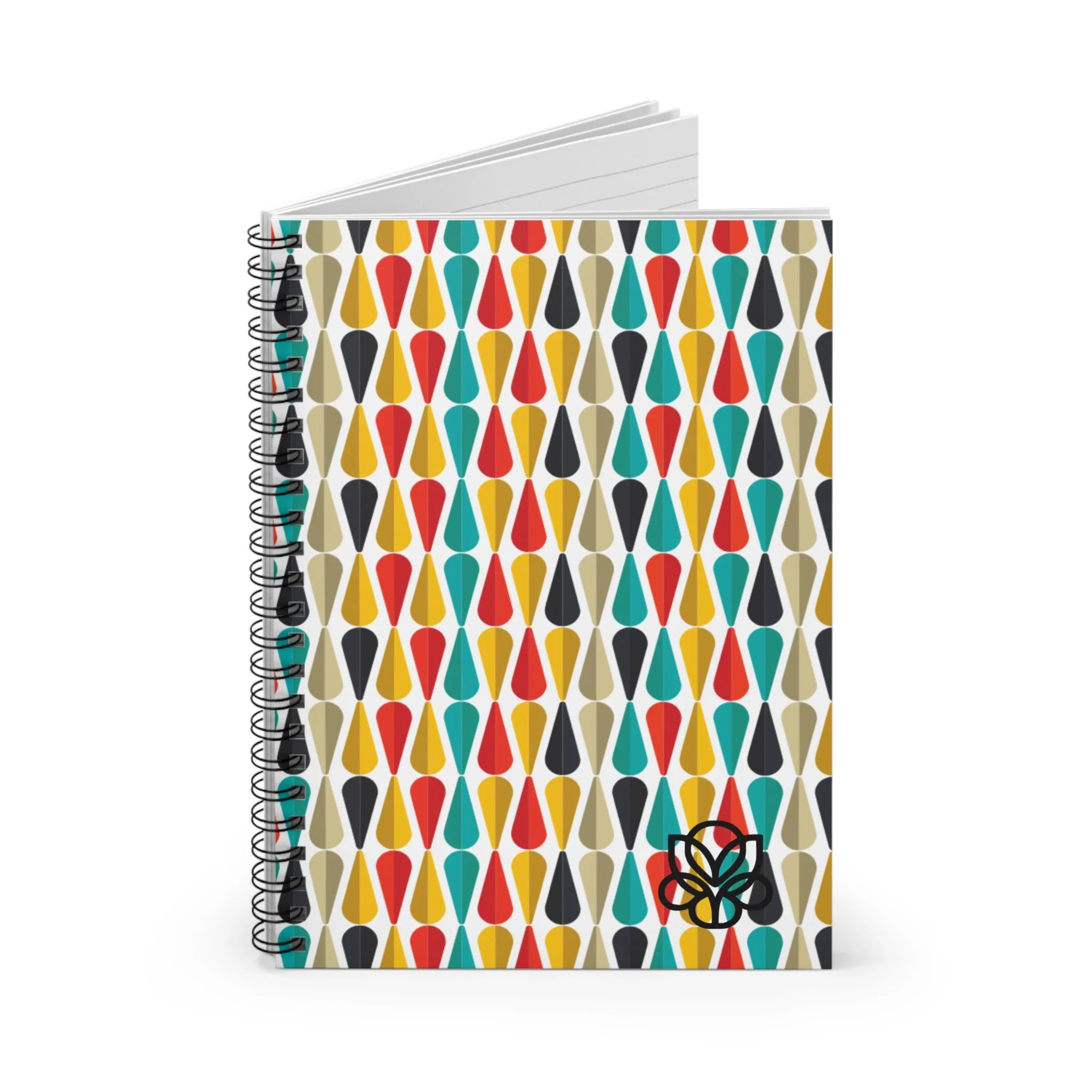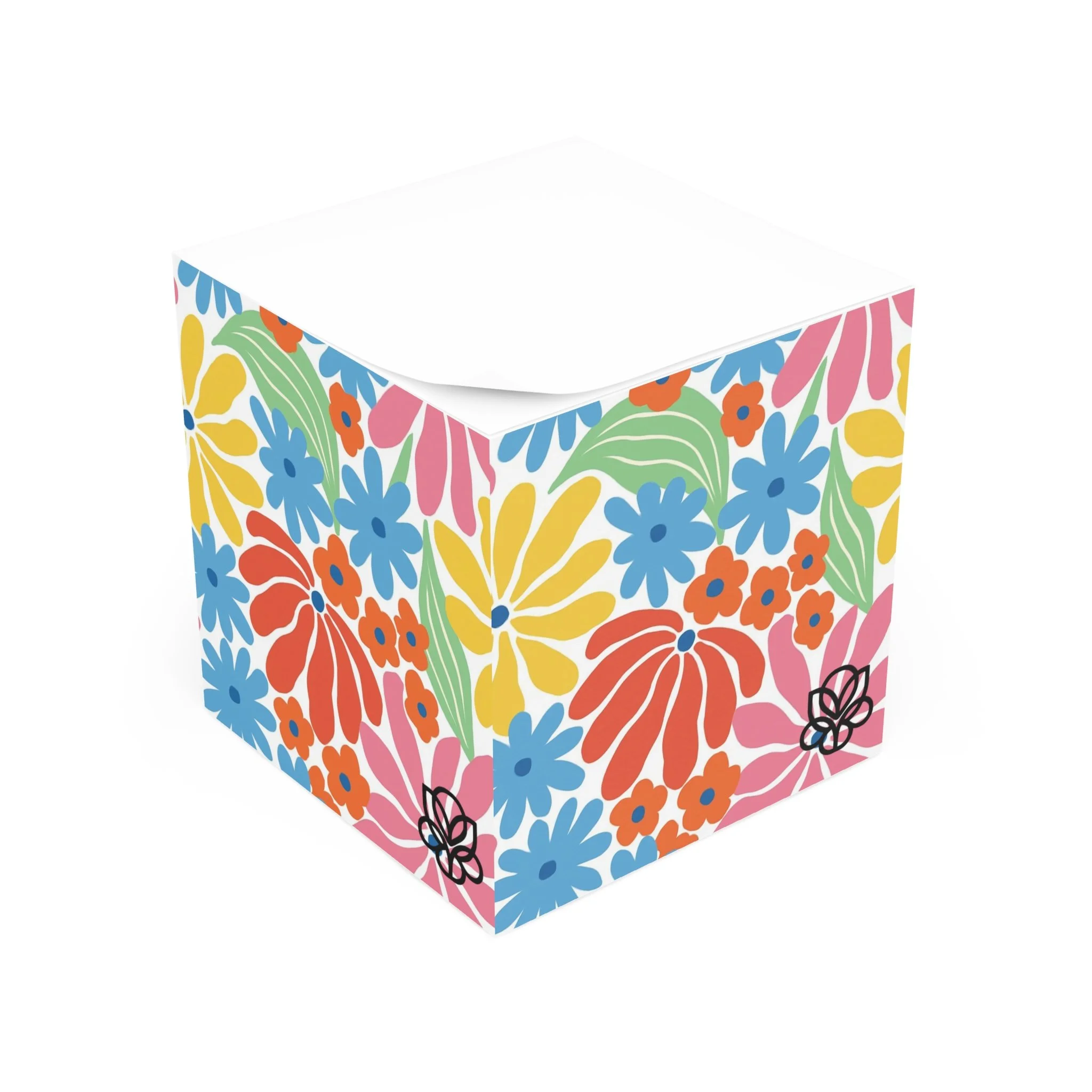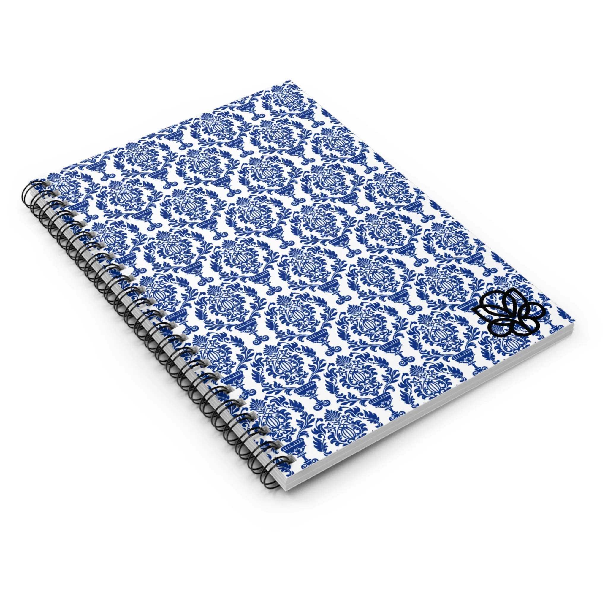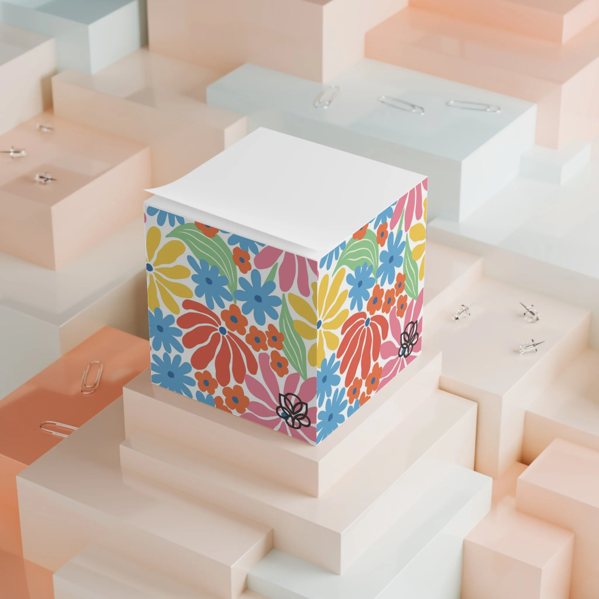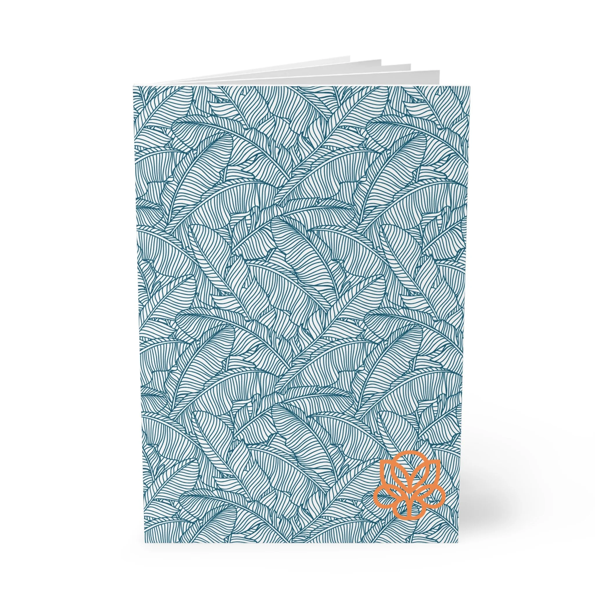 A clay pot with abstract blue, white, and terracotta paint strokes on a neutral background.