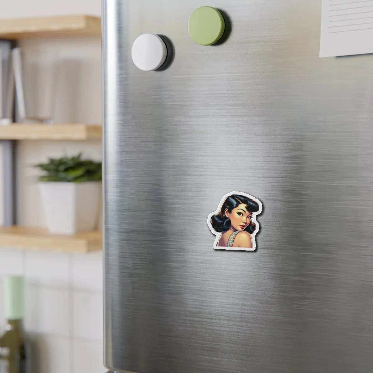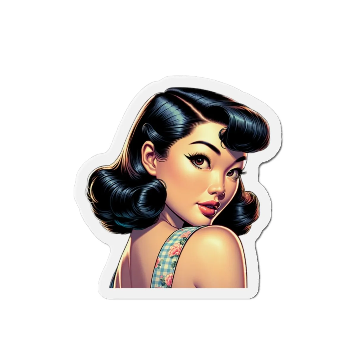A high-quality die-cut magnet that brings nostalgic pin-up charm to any magnetic surface. The matte-finish print keeps colors rich without glare, while the flexible vinyl body and black backing stand up to everyday use — from fridges and lockers to magnetic boards. The precise die-cut edge follows the artwork for a clean, custom silhouette that reads like a tiny piece of art on your door. Lightweight and durable, it holds photos, notes, and memories while adding a playful, vintage-inspired accent to kitchens, studios, and workspaces.