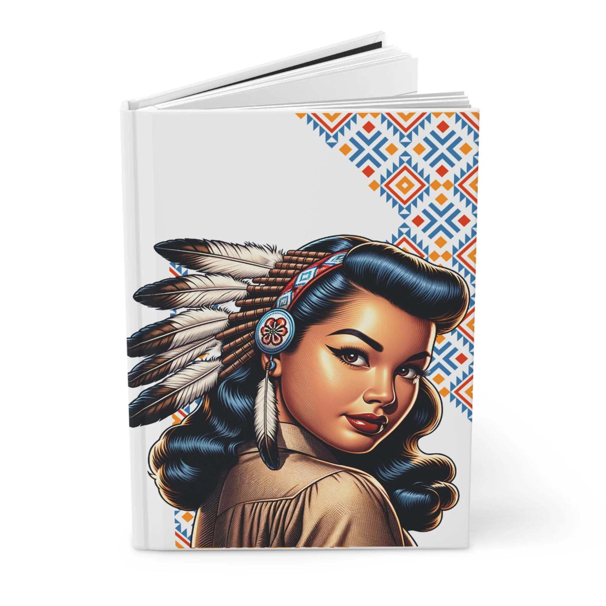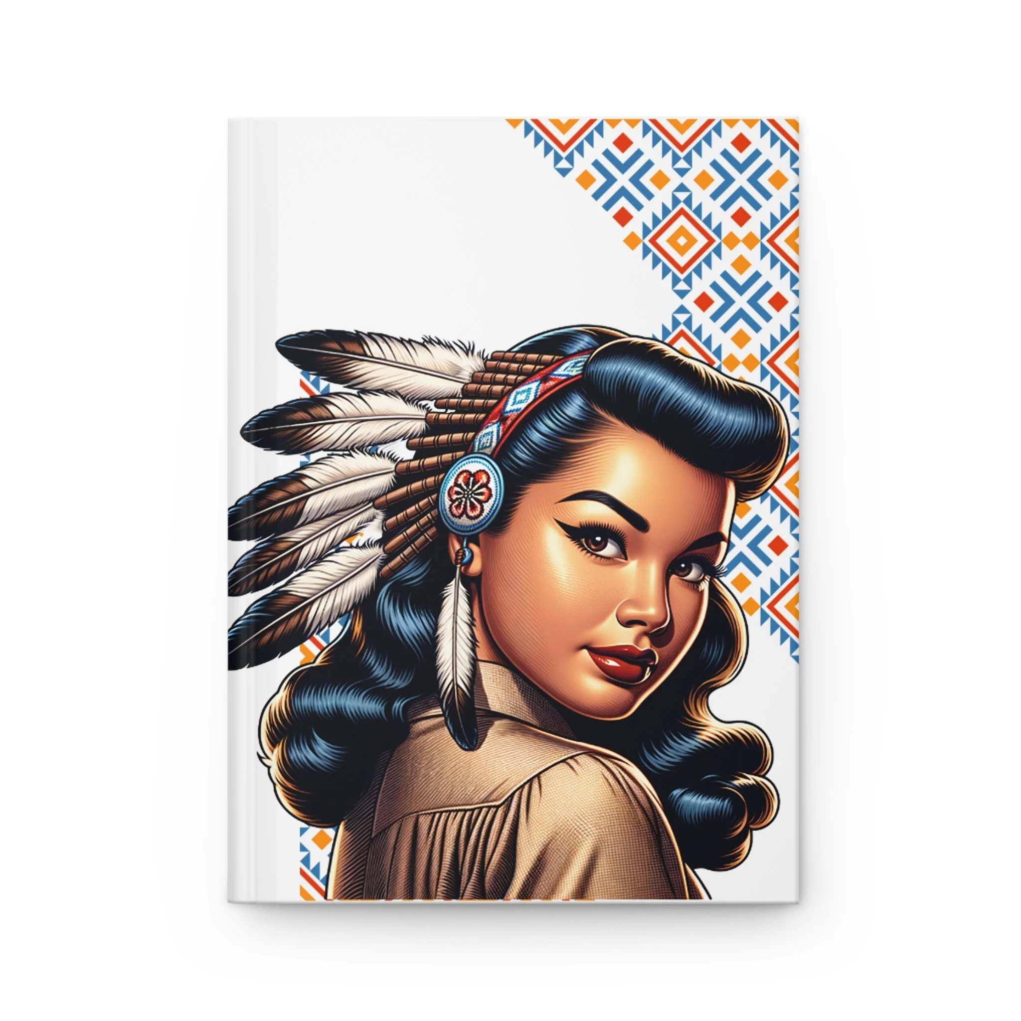 This hardcover journal brings together bold vintage portraiture and geometric patterning to create a striking, tactile notebook you’ll reach for again and again. The matte laminated cover feels smooth and durable while the wraparound design keeps the artwork continuous from front to back. Inside, 150 lined pages sit on a sewn spine that opens flat for comfortable writing. Perforated sheets let you cleanly remove pages when you want to share a sketch, list, or note. Use it as a daily diary, travel log, or a place to sketch character studies — its vibrant printing keeps details sharp, and the matte finish reduces glare so your focus stays on the page. A small production barcode appears on the back cover.
